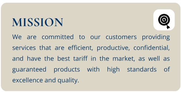 We are committed to our customers providing services that are efficient, productive, confidential, and have the best tariff in the market, as well as guaranteed products with high standards of excellence and quality.